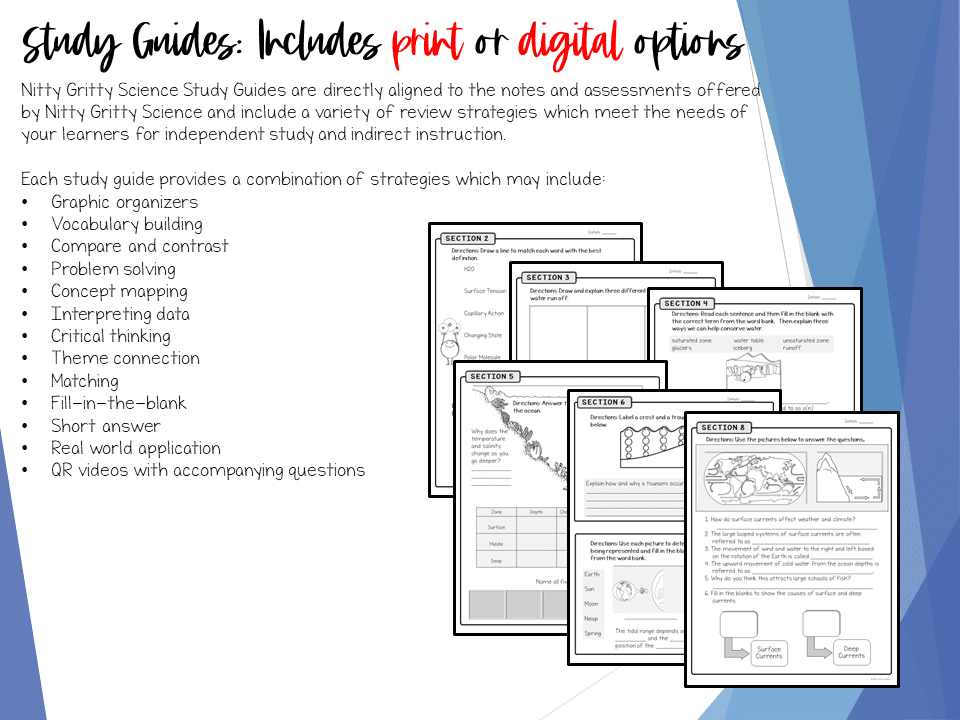 EARTH SCIENCE STUDY GUIDE BUNDLE designed for students to strengthen their content mastery by using as a chapter review or one-on-one/group support. All study guides are directly aligned to the notes and assessments offered by Nitty Gritty Science.