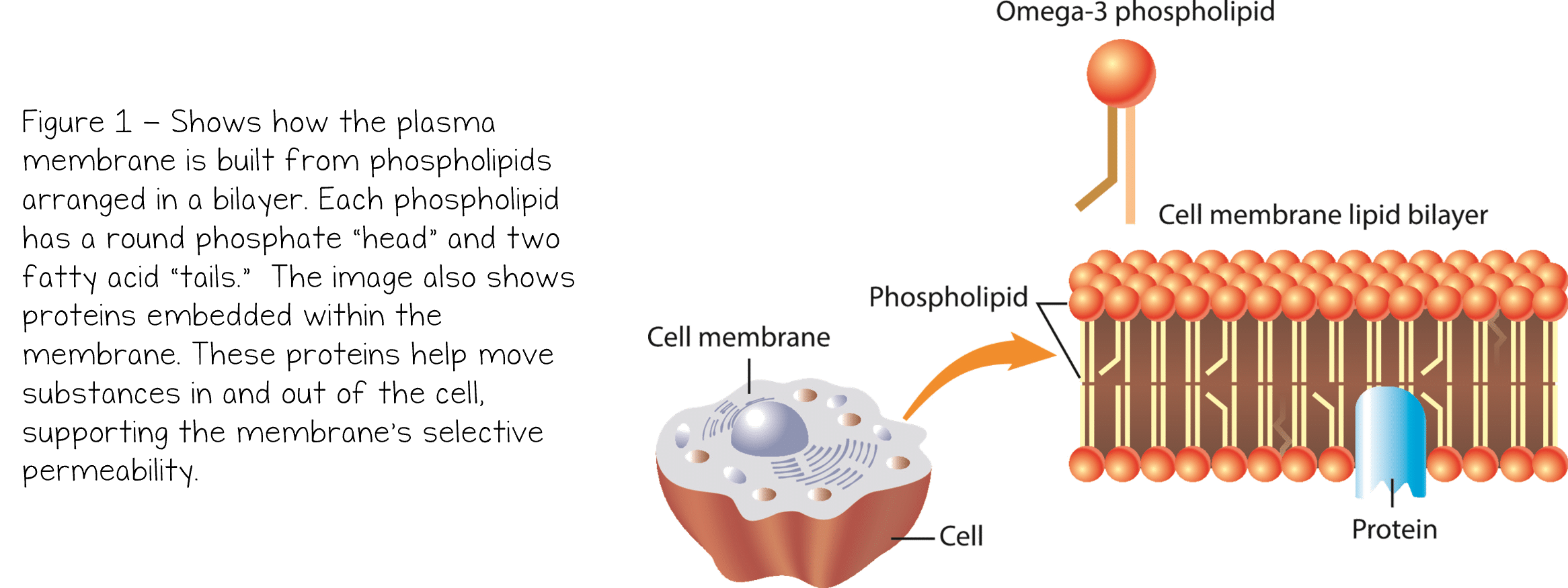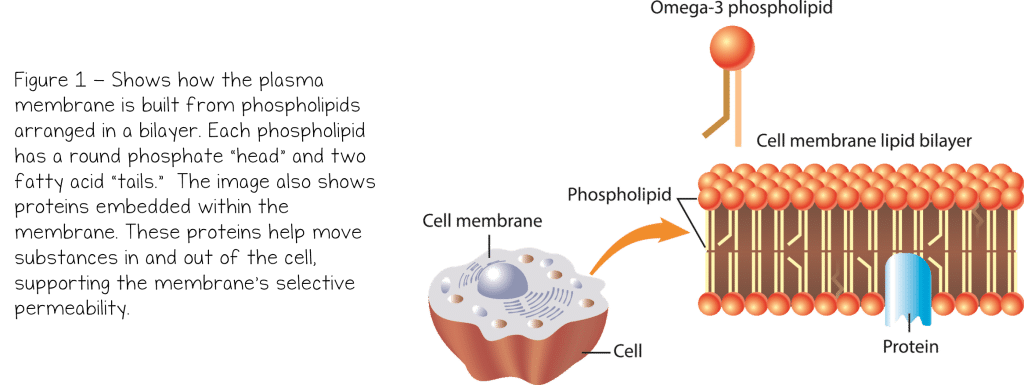 The plasma membrane, also called the cell membrane, is the thin, flexible boundary that surrounds a cell and separates it from its external environment. It helps protect the cell and plays an important role in controlling what enters and leaves. This ability to regulate the movement of materials is called selective permeability. Some substances can pass through the plasma membrane freely, some can cross only under certain conditions, and others cannot pass through at all. The plasma membrane is primarily made of phospholipids, which consist of a glycerol molecule, two fatty acids, and a phosphate group. These phospholipids are arranged in a phospholipid bilayer, a double layer that forms the foundation of the plasma membrane. This structure provides flexibility while also creating a barrier that separates the cell from its surrounding environment.