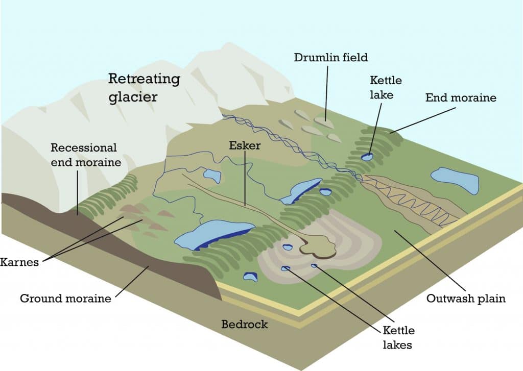 When a glacier melts, it deposits the eroded sediment, creating various landforms. These landforms remain even after a glacier has melted. A till is a mixture of sediment that is deposited directly on the surface. It’s made up of particles of many sizes. Clay, silt, sand, and boulders can all be found in a till. A moraine is a ridge formed from till deposited at the edge of glaciers. A kettle is a slight depression that forms when a chunk of ice eventually melts. Kettles often fill with water and become kettle lakes.
