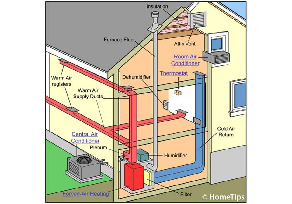 All heating systems require some source of energy. A long time ago, people burned wood, oil, or candles to generate heat and electricity, but today there are much more efficient methods. Common types include forced-air systems, radiator systems, and electric heating systems. A forced–air system is the most common type used for heating. It uses a furnace to heat the air, and then a fan blows the hot air through the ducts to the rooms throughout a home. A radiator system is a closed metal container that contains hot water or steam, which is transferred to the surrounding air by conduction; this heated air moves through each room and warms it up by convection. Finally, in an electric heating system, coils heated by electricity are placed in floors and walls to heat the surrounding air by conduction.
